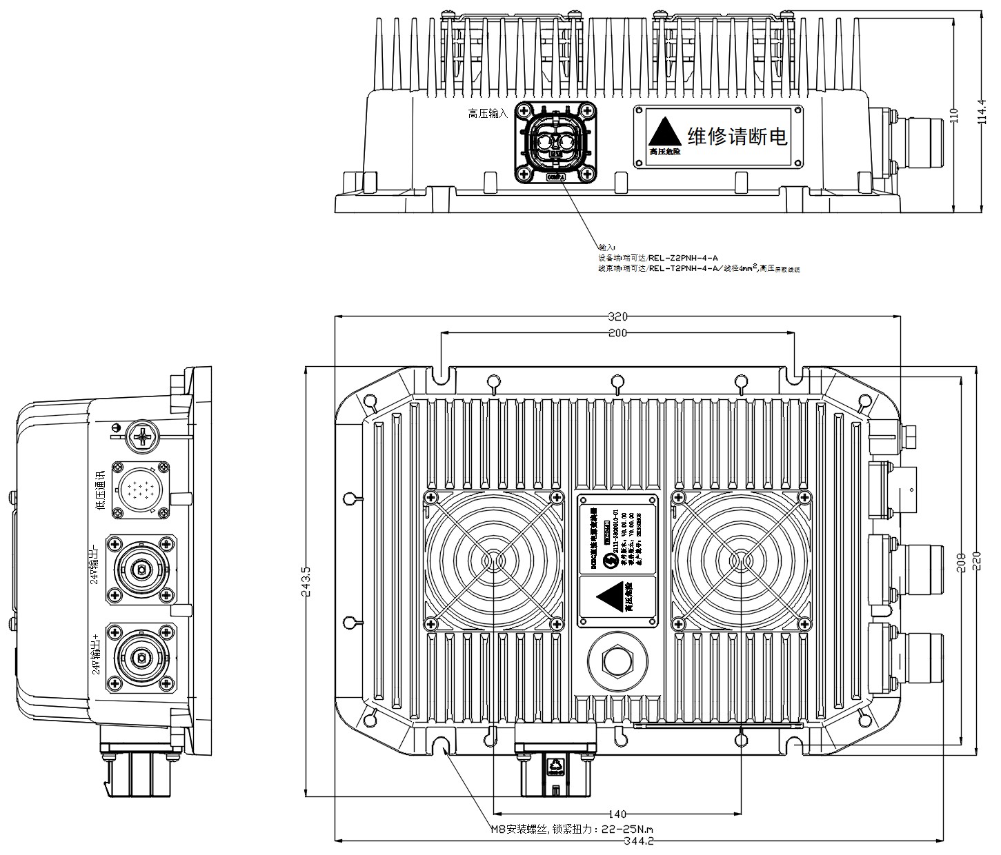 1 电源变换器安装方式: 卧式安装。本设备属于高发热源, 需保证散热良好,非耐温部件尽量不要靠近布置。
